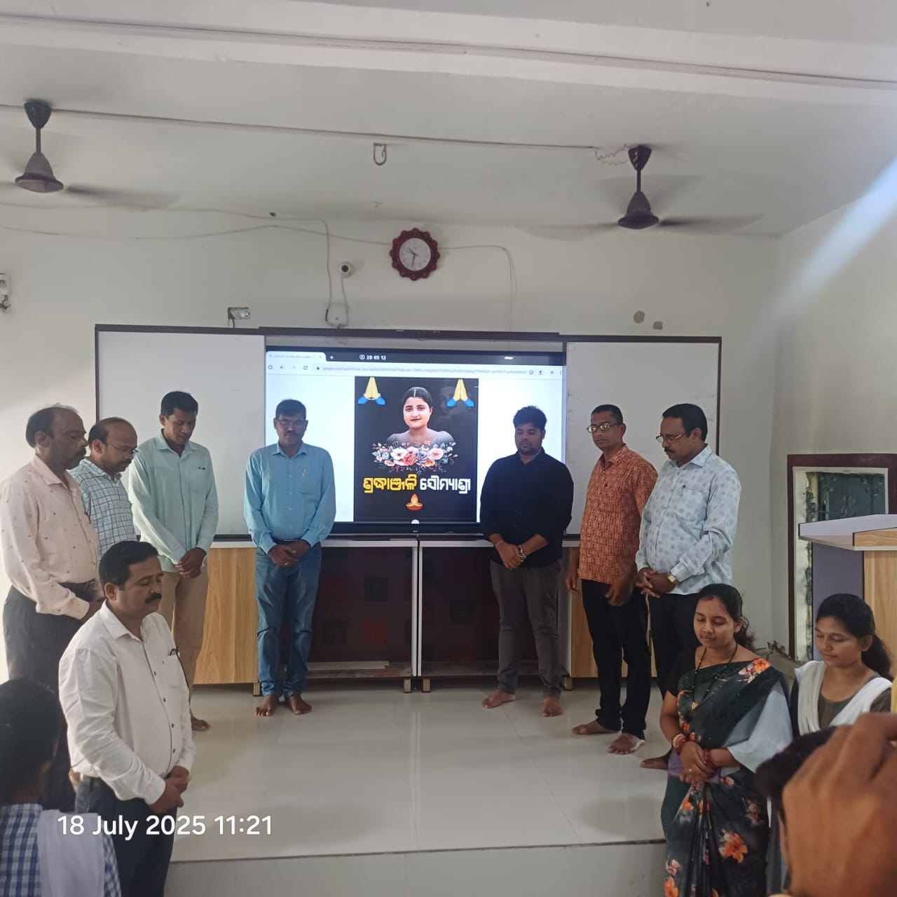 ପଦ୍ମପୁର-ପଦ୍ମପୁର ଉପଖଣ୍ଡର ଲଖମରା ସ୍ଥିତ ଉଚ୍ଚ ମାଧ୍ୟମିକ ବିଦ୍ୟାଳୟରେ ଦିବଙ୍ଗତ ସୁଶ୍ରୀ ସୌମ୍ୟା ବିଶିଙ୍କ ଅକାଳ ବିୟୋଗରେ ଏକ ଶୋକସଭା ଅନୁଷ୍ଠିତ ହୋଇଯାଇଛି l ଏ ଅବସରରେ ଯୁକ୍ତ ଦୁଇ ଦ୍ଵିତୀୟ ବର୍ଷର ସମସ୍ତ ଛାତ୍ରଛାତ୍ରୀ, ଅଧ୍ୟାପକ, ଅଧ୍ୟାପିକା ଓ ଅନ୍ୟାନ୍ୟ କର୍ମଚାରୀ ସୌମ୍ୟାଙ୍କ ଅମର ଆତ୍ମାର ସଦଗତି ନିମନ୍ତେ ଦୁଇ ମିନିଟ ନିରବ ପାର୍ଥନା ସହ ଶ୍ରଦ୍ଧାଞ୍ଜଳି ଜ୍ଞାପନ କରିଥିଲେ ।